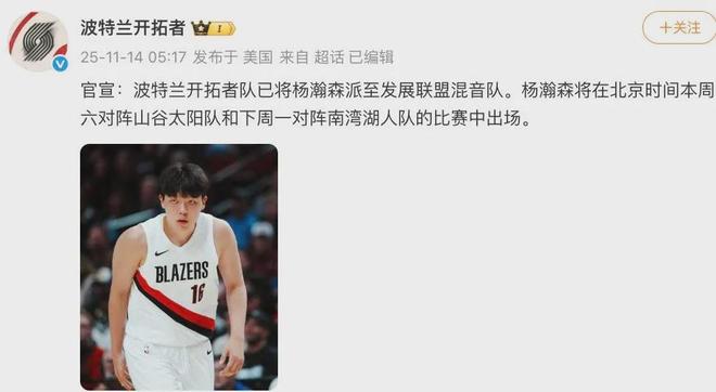 开拓者宣布再次下放杨瀚森到G联赛混音队,这次不仅训练,还会完成NBA发展联盟首秀。